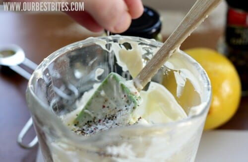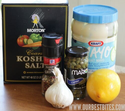 You’ll need mayonnaise (homemade would be delicious, just leave out the garlic and rosemary; clearly, I’m not using homemade mayonnaise here…), kosher salt, freshly ground black pepper, garlic, lemon juice, and capers. Unless you really hate capers–just leave ’em out if that’s the case.