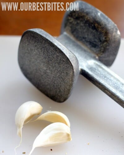 Chop the capers and then peel the garlic and mince or press it. Now…some of you may remember last fall when I was using a big knife to smash and peel my garlic and the blade wobbled on the garlic and I sliced the heel of my hand open. We can’t forget it around our house because, in addition to my lovely scar, my four-year-old keeps talking, especially to strangers and visitors, about the time I used a big knife to cut my wrist open while I was making dinner. Since then, I’ve been scared of smashing garlic with big knives, so I’ve put my once-rarely-used meat mallet to good use.
