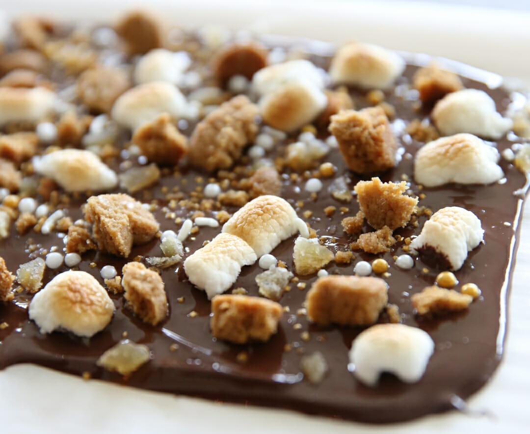 One of my favorite components of the winning recipe was not only marshmallows- but specifically toasted marshmallows. To make these simply place marshmallows on a baking sheet and pop them under a broiler. You’ll want to stand right there and watch and take them out when they are toasty brown. While they’re still just barely warm they will pop right off your baking sheet and on your chocolate. If you let them cool all the way they get a little trickier to remove! These add the most amazing chewy-soft texture to this chocolate bark!