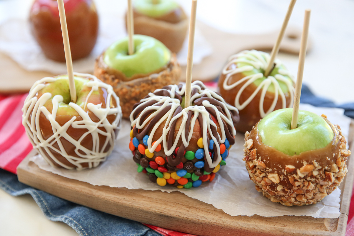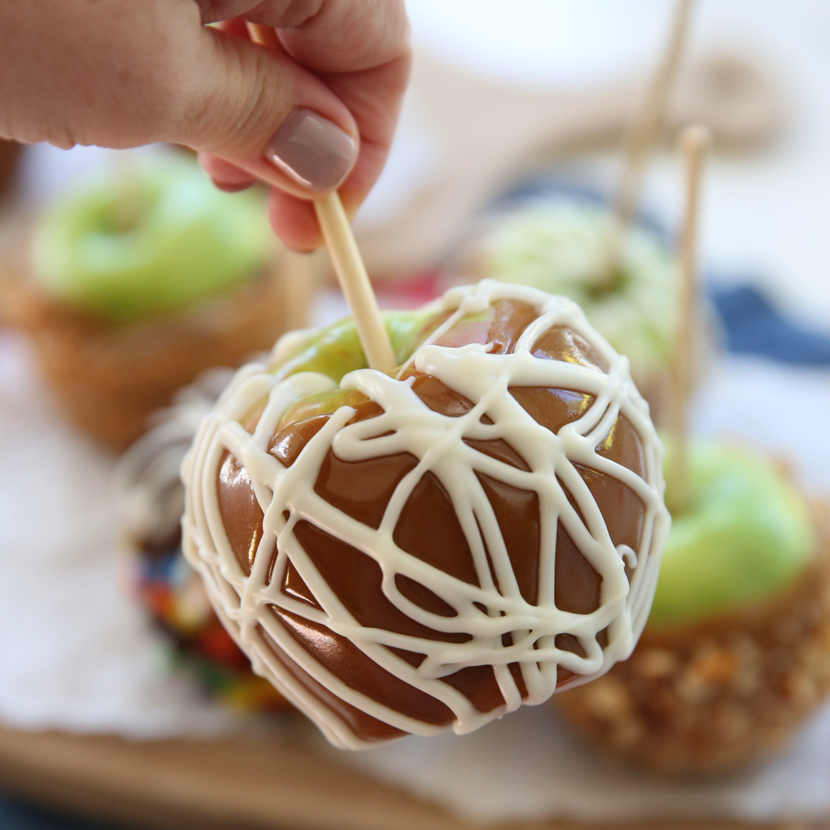 These ones are Honeycrisp, one of my fave varieties. They’re good for dipping because they’re so crisp they can really stand up to all of the toppings. However, if I had to choose, I gotta say when it comes to dipped caramel apples, I still love a really tart green one.