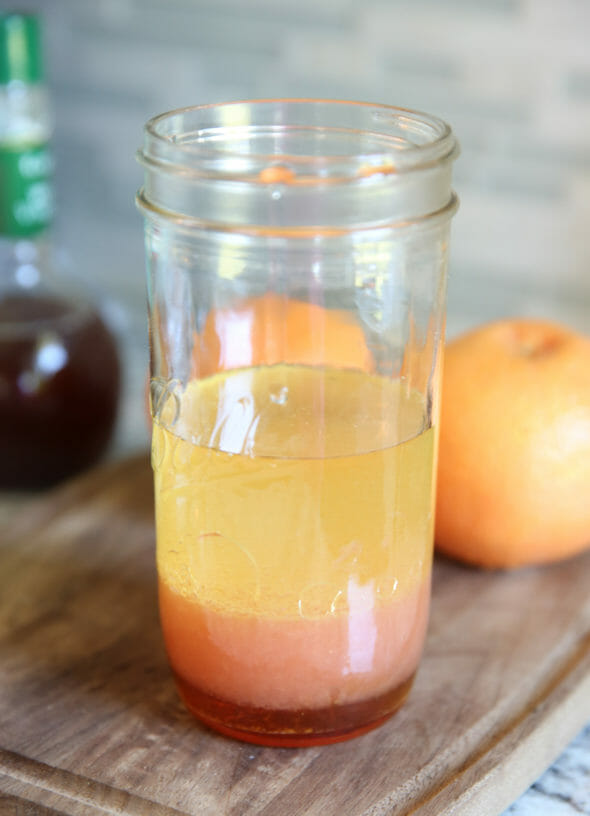 1. You’ll need the juice from about 1 large grapefruit. To that you’ll add some red wine vinegar, a few seasonings, and canola oil.  You can definitely play around with different vinegar; I grabbed the red wine because (aside from the flavor) the color works well here and enhances the blush hues.
