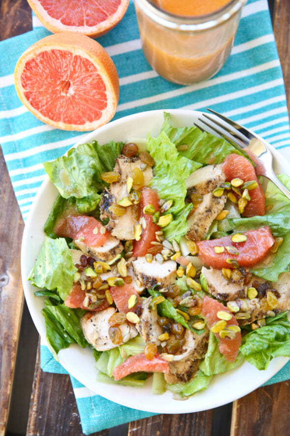 • You can serve it on your choice of salad ingredients but just remember that it’s a more delicate dressing, so it works especially well with lighter greens, like a spring mix, spinach or romaine. The pictures below include grilled chicken, grapefruit segments, golden raisins, pistachios, sunflower seeds and feta (ok, I forgot the feta in the pictures, but it SHOULD have been there!). Avocado would also be amazing with all of this stuff.  Be creative and try it out.  It’s perfect for later-summer meals on the patio!