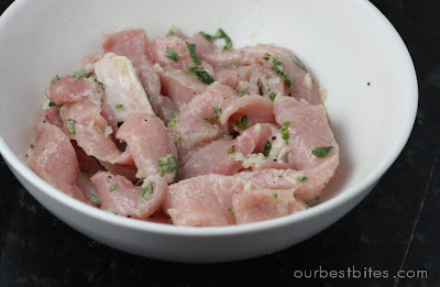 This is normally the part of the post where we throw in a funny story or charm you with our witty commentary, but I don’t have time for that tonight! I’ve got a cranky baby and kids up way too late so we’re just gonna start cooking. Okay? Okay! So I have a few quick and easy dinner ideas up my sleeve because it seems like this time of year people like to avoid the oven. This one just involves a quick saute for the meat and the rest is tossed together cold. The great thing is that this whole meal can be made in less than 30 minutes. Maybe even less than 20. You don’t need to marinate the meat for long. Since it’s sliced thin it picks up the strong flavors of lemon and garlic super fast. I’m using pork here because I have some to be used up, but chicken or even steak works great too.