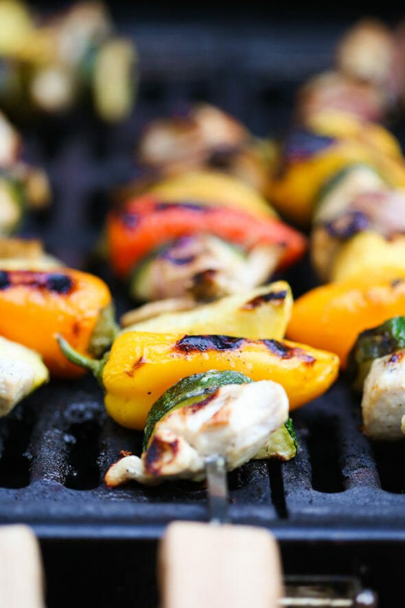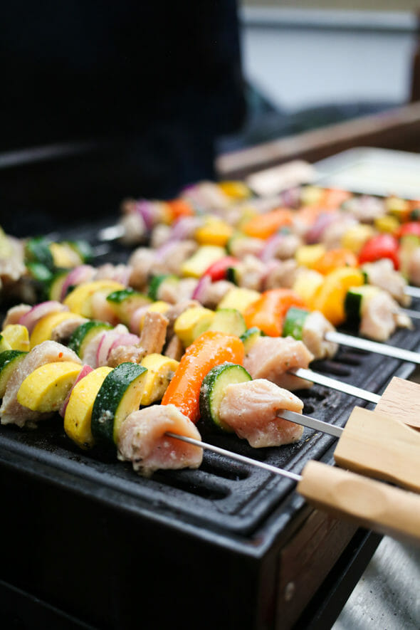 Be sure to cut all of your veggies and meat into similarly sized pieces. When threading your skewers, don’t pack the ingredients tightly together. Leave a little space for the heat of the grill to cook everything through.