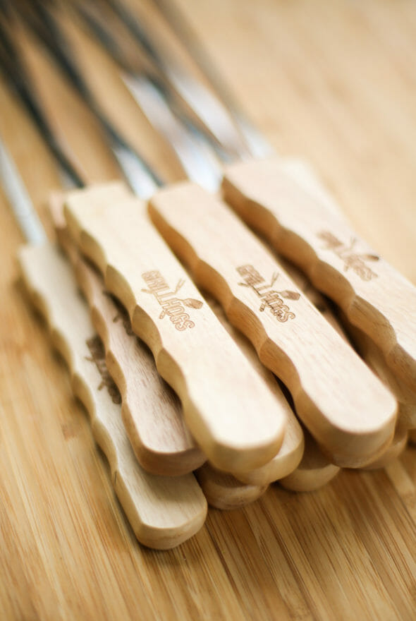 Bamboo skewers have to be soaked and are hard to handle once hot on the grill. Metal skewers can also be troublesome when trying to turn. I did some poking around the internet and stumbled across lots of options for metal skewers with wooden handles and I love them! There are also varieties with silicone handles available. You leave the handle on the outside of the grill (the lid still closes just fine) and then you can easily turn your skewers– no soaking, no fires, no burned fingers.