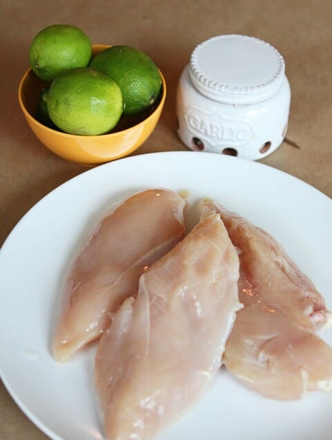 For the chicken, you’re going to need a pound of boneless skinless chicken breasts, limes, garlic, red wine vinegar, olive oil, salt, and black pepper.