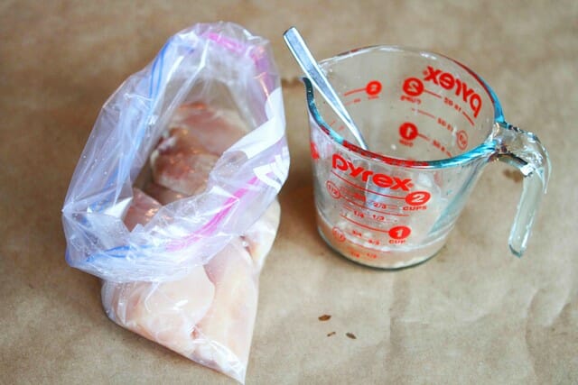 - Rinse the chicken and place in a large zip-top bag. Whisk together the remaining chicken ingredients in a small mixing bowl and pour it over the chicken. Marinate the chicken for at least 4 hours, no longer than 24 hours.