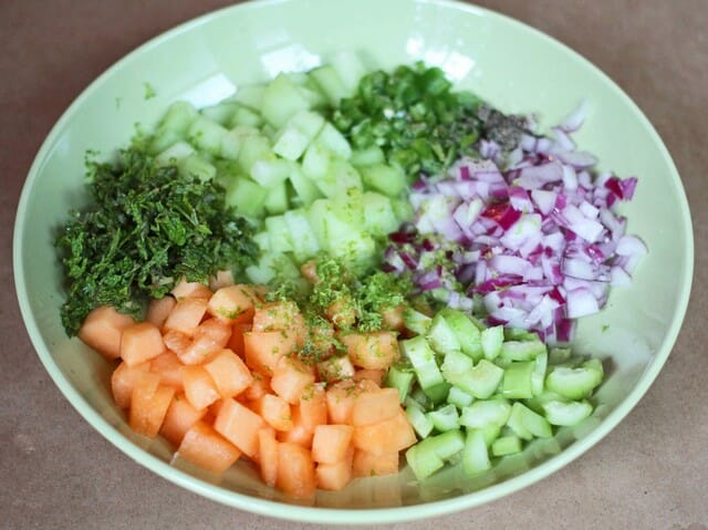 An hour before serving, dice 2/3 cup each of cantaloupe and honeydew, 1/3 cup each of red onion and seeded, peeled cucumber, some chopped mint and seeded jalapeno, the zest and juice of a lime, and some sugar (or honey or agave), salt, and pepper in a small-medium mixing bowl.