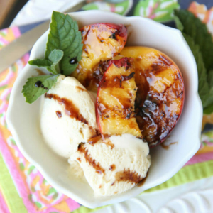 - Place peaches on grill for 1-2 minutes, turning just once, to create grill marks on all sides. Remove from grill and let rest while you scoop ice cream.