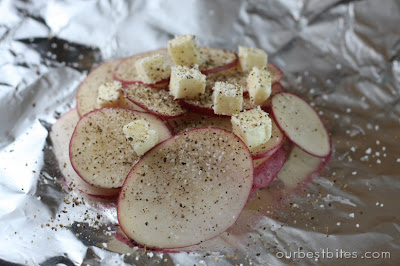 Fold edges in and secure tightly. It’s important to get a good seal because the moisture will cook the potatoes and onions and you want all those yummy juices, so if it seems like there’s not quite enough foil, wrap packet in another layer.
