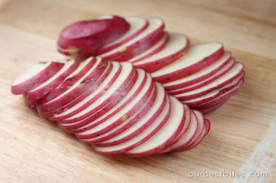 Preheat grill. Slice potatoes into pieces about 1/8-1/4″ thick