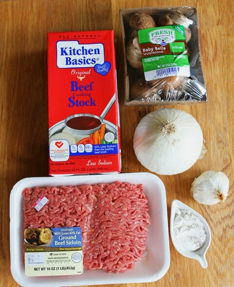 You’re going to need a pound of ground sirloin, a large white onion, 4-5 cloves of garlic, butter and olive oil (but not much of each because this recipe is surprisingly healthy), a cup of sliced mushrooms, all-purpose flour, beef broth or stock, red wine vinegar, and kosher salt and freshly ground black pepper. You also might want mashed potatoes or white rice for serving, although I ate this with a side of green beans and it was still pretty amazing.