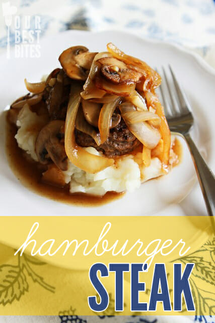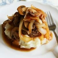 When the onions and mushrooms are cooked, sprinkle them with 1 tablespoon of flour and stir quickly to combine. Add the broth and vinegar and cook until thickened. Add the beef patties and heat through. Serve each patty over mashed potatoes and top with mushrooms, onions, and gravy. If you’re wanting to be fancy (believe it or not, I think you could pull this off as a fancy meal), heat the patties separately and place them on carefully mounded mashed potatoes and then spoon the gravy, onions, and mushrooms on top (it looks a little cleaner this way). If you want, you could garnish with green onions. Serves 4.