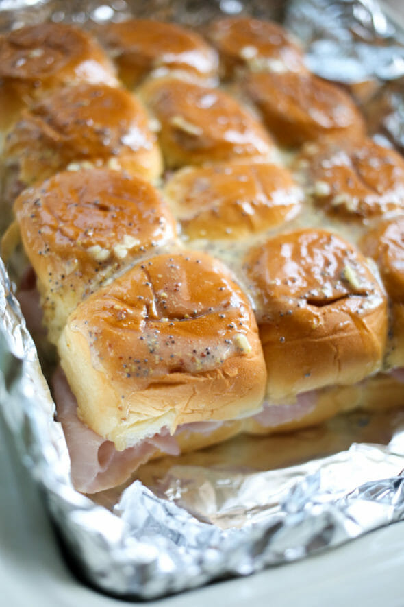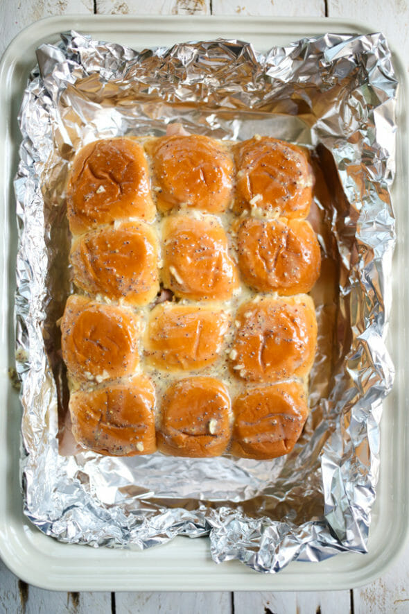 - Place the top half of the rolls on top of the bottoms with the ham and place the entire thing onto a sheet plan lined with foil.