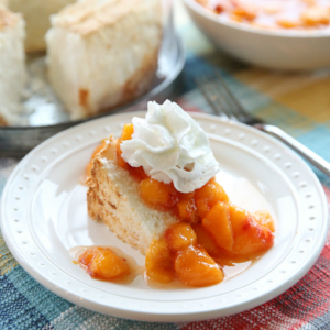 Homemade Angel food cake is a favorite around here with strawberry shortcake, but we’ll use any good fruit we can get our hands onto. I’m using some fresh peaches from my Dad’s tree that I had frozen last summer and they were perfection.