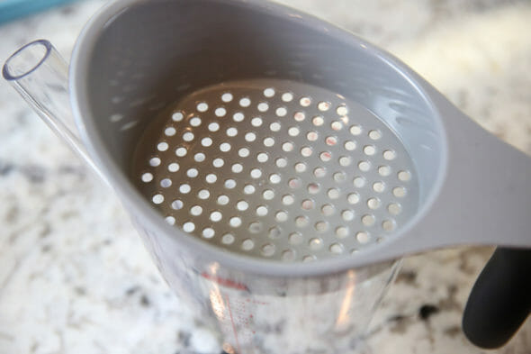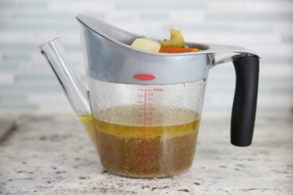There’s a large hole strainer on top to strain out any big chunks. All you do is pour all of the juices and fat in there together. Just quickly empty out that pan. Fat will naturally rise to the top as it settles. If you do this with a normal measuring glass, when you start to pour, you’re pouring the fat. Notice on the fat separator, the spout connects at the bottom, so you just pour out the flavorful juices and can easily stop when you get to the fat. I seriously use this thing all the time, and you might want to pick one up before Thanksgiving- it will come in handy!