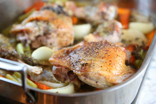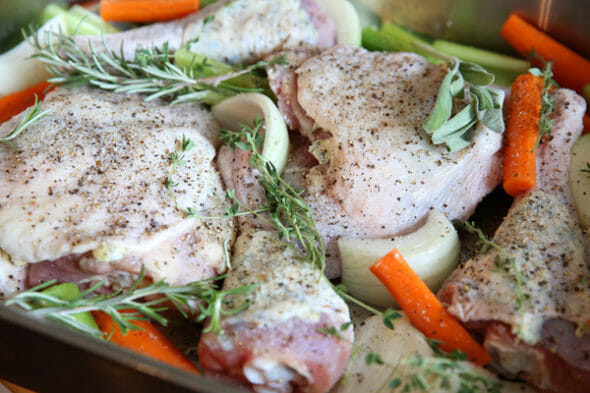 Drizzle all of that with a few tablespoons of olive oil and then season it all with salt and pepper and some fresh herbs like rosemary, thyme, and sage. Cover the pan and roast at 350°F until the meat registers 165°F, removing the lid about halfway through. You’ll get a turkey dinner one night, and juices for a batch of gravy for the freezer!
