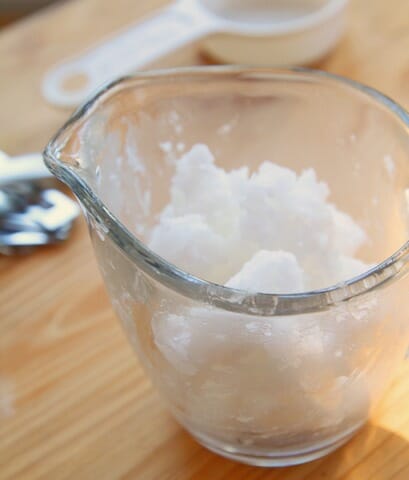 Place the coconut oil in a 1-cup glass measuring cup (you can get one for, like, $2 at Target or Walmart that you use only for lip gloss making)
