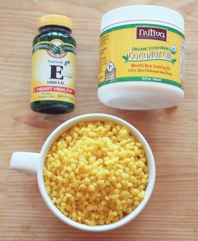 For the base of your lip gloss, you’re going to need coconut oil, beeswax, and Vitamin E (I just got the capsules).