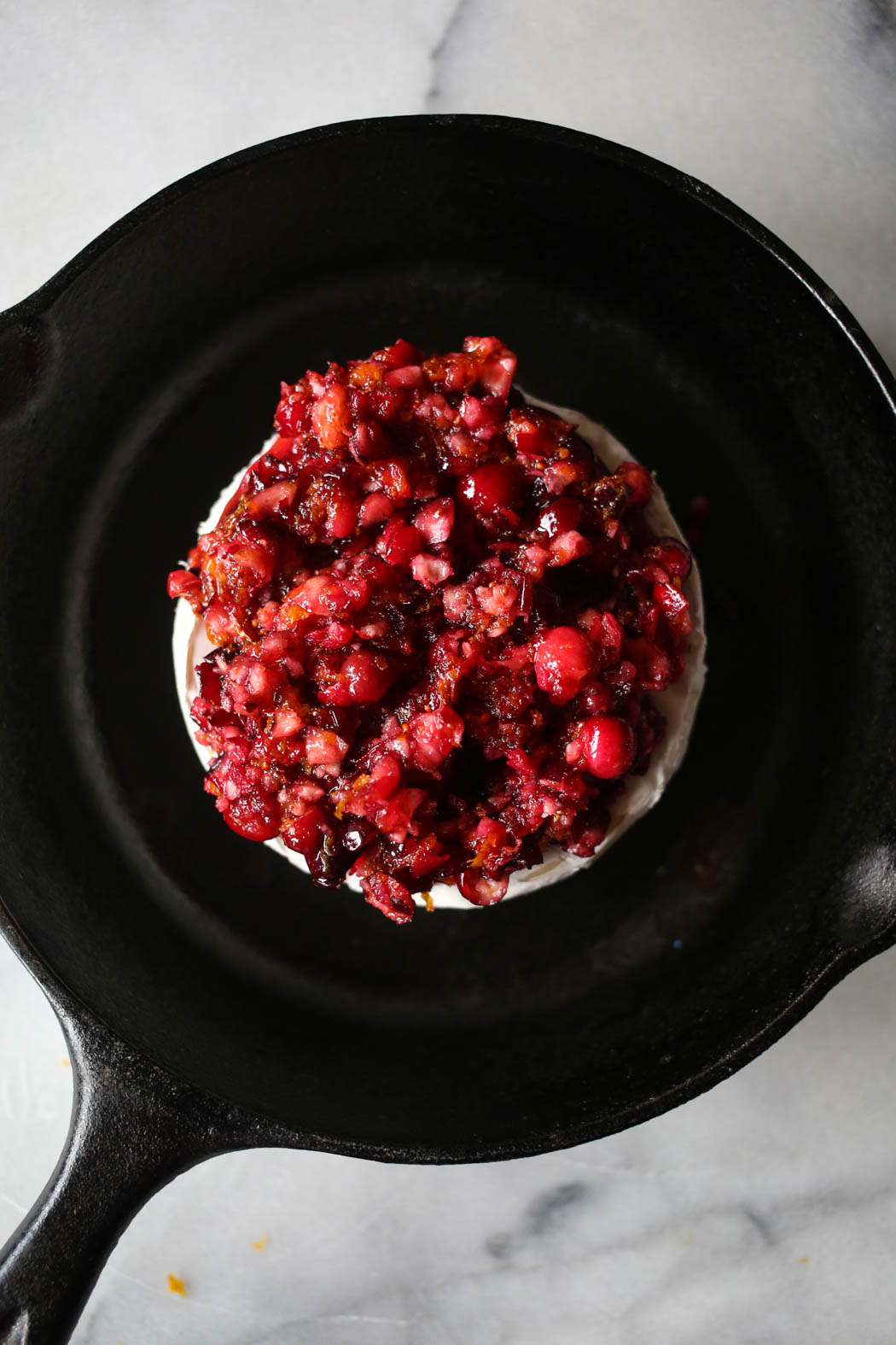 - Preheat oven to 350℉. Place the wheel of Brie in a small oven-safe skillet (I love these mini cast iron skillets!) or on a parchment-lined baking sheet. Set aside.