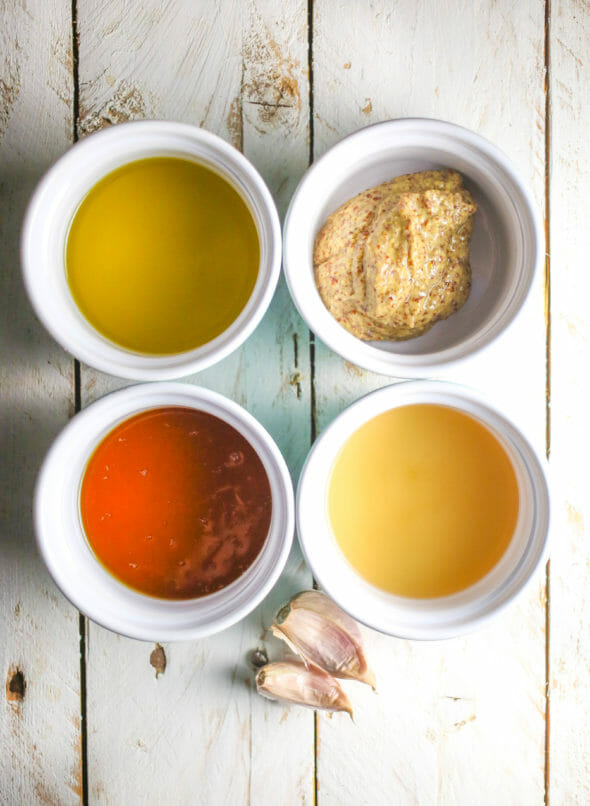 - This recipe is so easy. Just a few ingredients, just a few minutes. In the jar of a blender, combine the mustard, vinegar, honey, and garlic. Blend until smooth.
