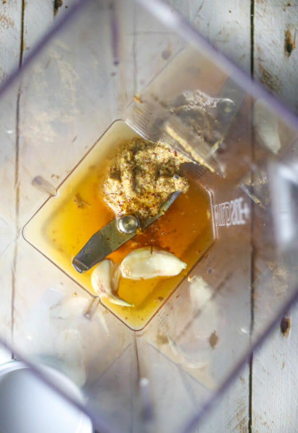 - In the jar of a blender, combine the mustard, vinegar, honey, and garlic and blend until smooth.