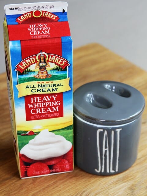 For the actual butter, you’re going to need heavy whipping cream and salt. I like kosher salt, but flaked sea salt would also be delicious. I think regular table salt is a little heavy-handed here and takes away from the sweet, delicate flavor of the butter, and coarser sea salts may not dissolve in the butter, which most people don’t really dig.