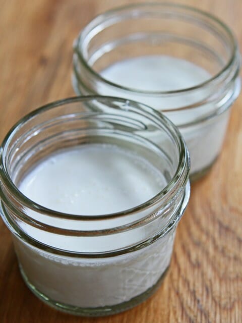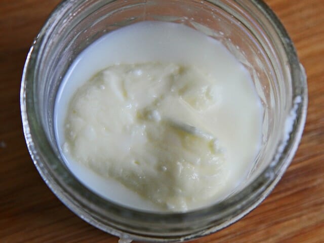 Place the lids on the jar and shake the jars vigorously until solids form (this took us about 10 minutes of consistent shaking). You should have a light yellow lump surrounded by thinner liquid.