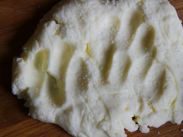 Squeeze as much of the liquid out of the butter as you can. There will bet a lot of liquid. Don’t be alarmed–assuming you used at least a pint of cream, you’ll still have plenty of butter. Keep squeezing until you’re not getting any liquid out, then open up the towel.