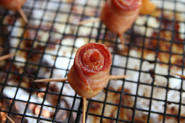 This not only holds the bacon together, but it creates a little stand for it, so it doesn’t topple over during cooking. Place those little beauties on a rack, sitting over a foil-lined baking sheet. Cooking them on a rack lets the bottoms cook as well so you don’t end up with mushy-bottomed flowers. Because that would be an atrocity.