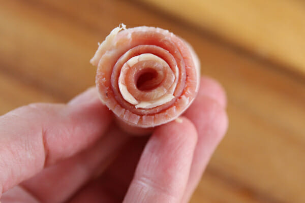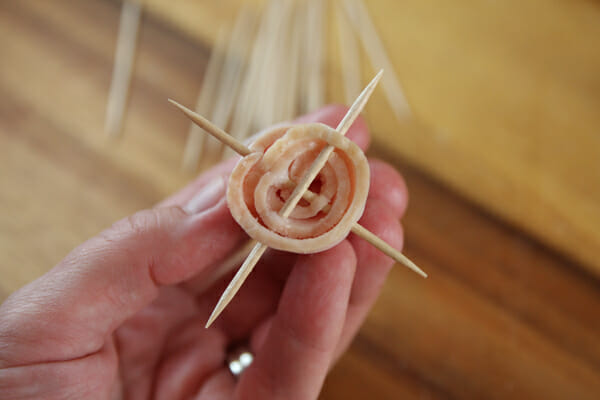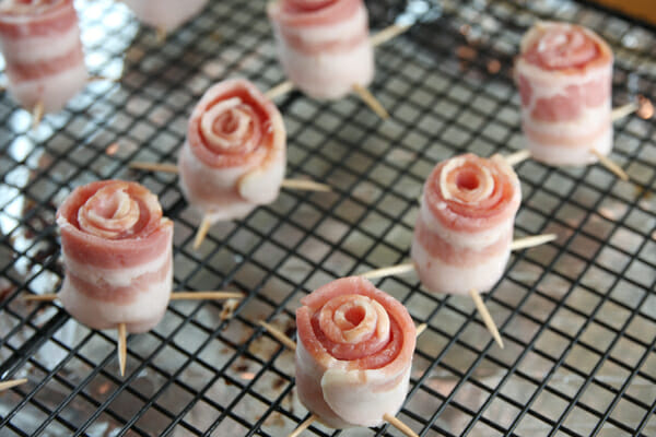 Remember this tutorial on cute little felt rosettes? Sort of the same thing going on here. But with bacon. Oooh, is anyone else having visions of a bacon wreath now? Just me? Okay. Anyway, take a strip of bacon and roll it up. Most strips of bacon have a “meaty” edge and a “fatty” edge. You’ll want the meaty edge to be the top of the flower, so keep the fatty edge aligned at the bottom. On a side-note, I think that’s the first time I’ve used the terms “meaty” and “fatty” when describing flowering shrub. I knew I went into horticulture for a reason…