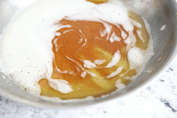 4. You’ll want to let it bubble away gently, while stirring, and soon the foam will subside and you’ll start to see little brown pieces on the bottom of the pan.   Those are the milk solids starting to toast.  At this point your house will smell almost like roasted hazelnuts.  It’s a really warm, nutty aroma.