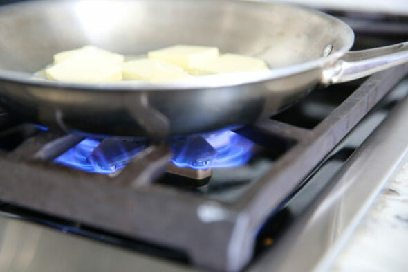 1. You’ll want to start with a light colored pan (like stainless steel.)  If you use a dark coated pan you won’t be able to tell when it’s browned and it can go from brown to burned pretty darn quick.  Use unsalted butter.  You can brown salted butter, but all of the salt gets concentrated in the milk solids and depending on how you’re using it, it can ruin the flavor.