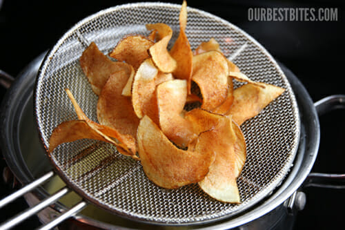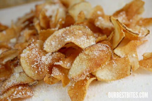 Place the chips on some folded paper towels and season immediately so the seasonings will stick onto the hot chips. At the very least, sprinkle them with some sea salt. At our house we love parmesan cheese on ours- and I don’t even use the good fresh stuff, I like the powdery stuff in a can because it stays on the chips!