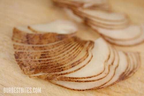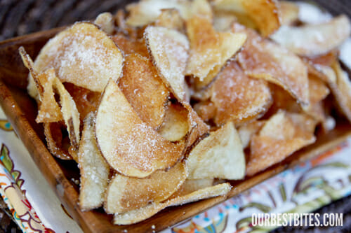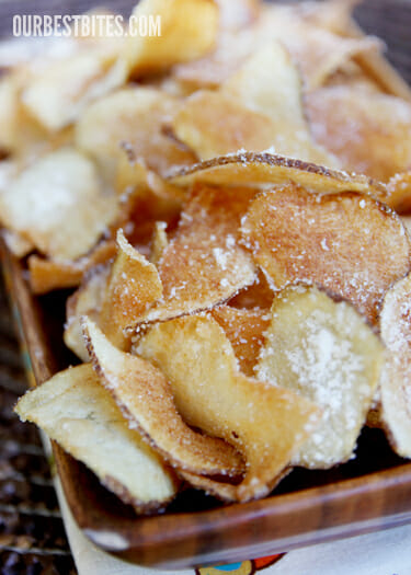 I promised some of you on Facebook a cool science trick to impress the kiddos today, but I’m changing my mind after making a batch of fresh potato chips and realizing while munching that I’ve never written about them here. And that’s a crying shame. I’ve mentioned before that I don’t fry a lot at home; it’s a once-and-a-while kind of thing at our house, so when we do it’s especially good. Maybe because it feels naughty. And admit it; sometimes a little bit of naughty is fun. Like this. Making your own chips is so easy and they’re so so so good. You can customize flavors and make them anywhere from super basic to super fancy. They go especially well with gourmet burgers like our BBQ Bacon Sliders or these Mar-a-lago Turkey Burgers. Watch how simple.