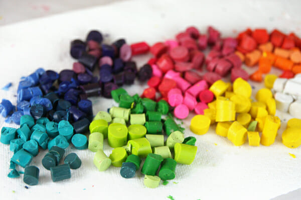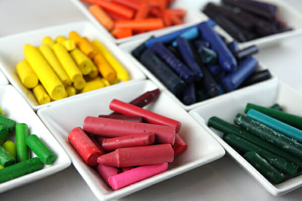 Rummage through your big bucket of crayons and pull out all of the misfits: broken, paperless, etc. Remove all the paper wrappers. For some reason, there’s always a few wrappers that seem to be attached with super glue. (Edit: Love this tip from a reader: for hard to remove papers, place crayons in a bowl of hot water for a few minutes and they slide right off!) Divide them by color if you are like me and obsessed with organizing things by color.