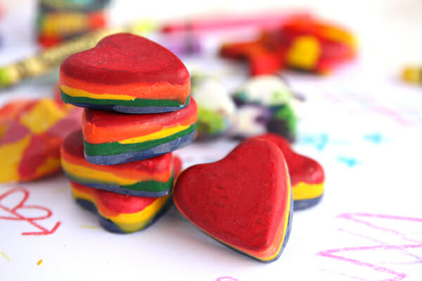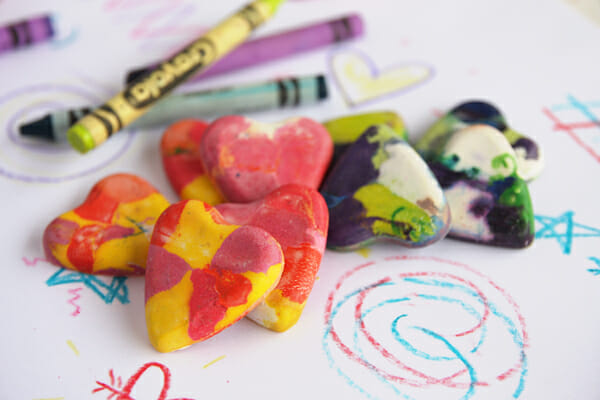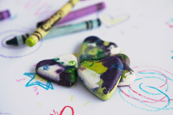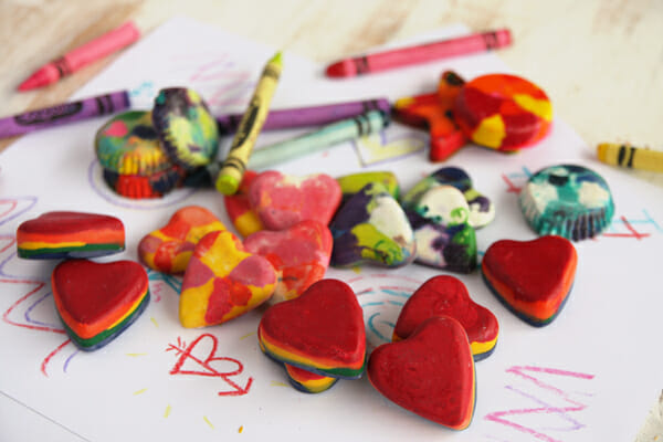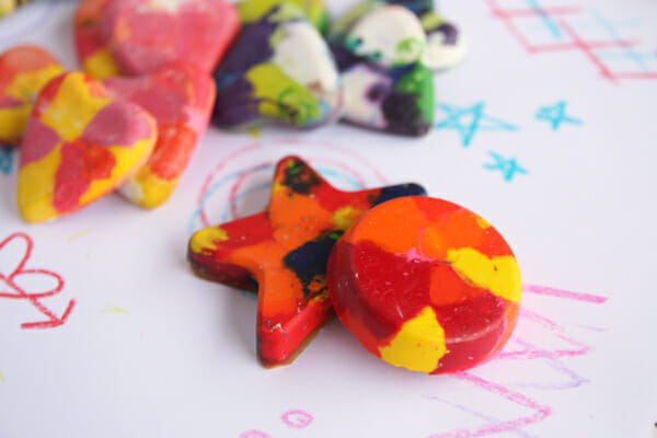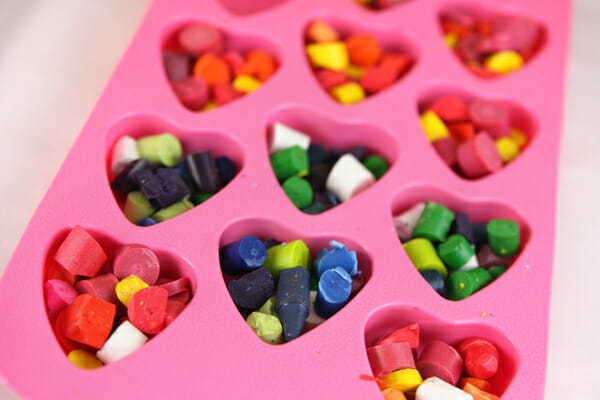 Or, try silicone molds for fun shapes. Be aware that the crayons will leave a residue on silicone, so use ones you don’t mind dedicating to crafts. And make sure to place your silicone molds on top of a foil lined cookie sheet when you put them in the oven; this is important!