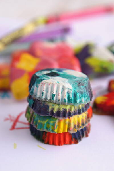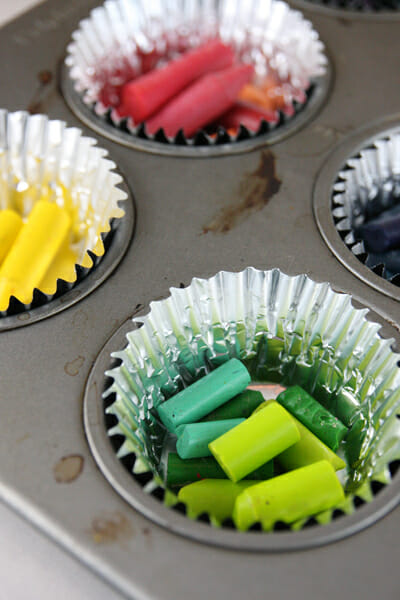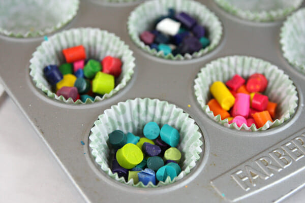 You can make solid color crayons or mix up the colors for multi-colored ones. Just nestle little piles of crayon bits into your muffin tin.