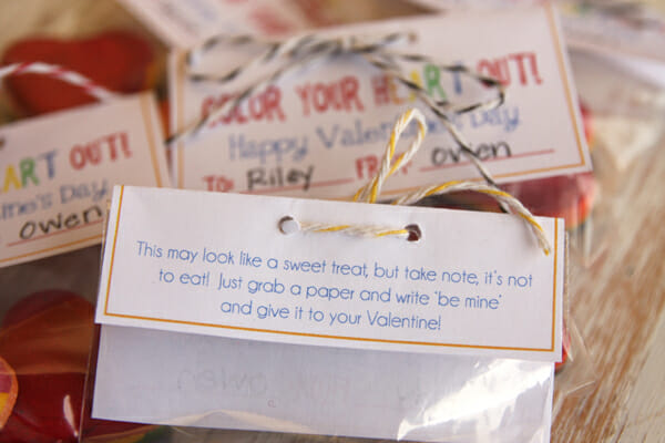 These are for the little 3 inch bags, but like always, you could just cut the labels out into rectangles and tie them on to any little baggie. And you certainly don’t have to use heart molds for this, any shape crayon would be super cute! In fact, these would also be super duper cute with our Candy Crayons. Dipped in red, pink, and white? Too cute.
