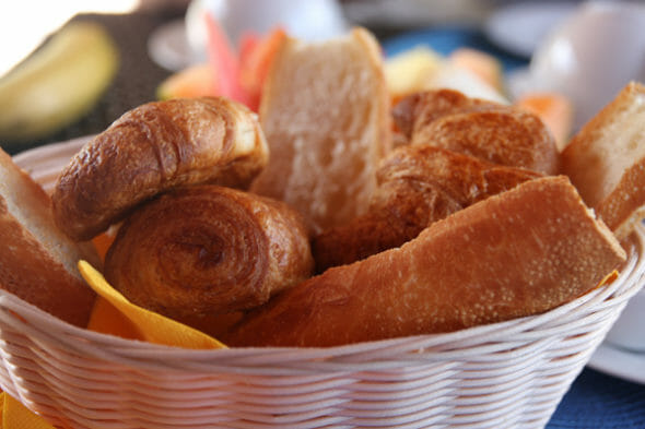 A huge platter of fresh pineapple, mango, and bananas, guava and mango jams, fresh squeezed juices and a basket of warm pastries from the French bakery next door. Amazing.