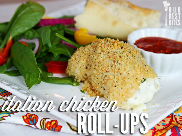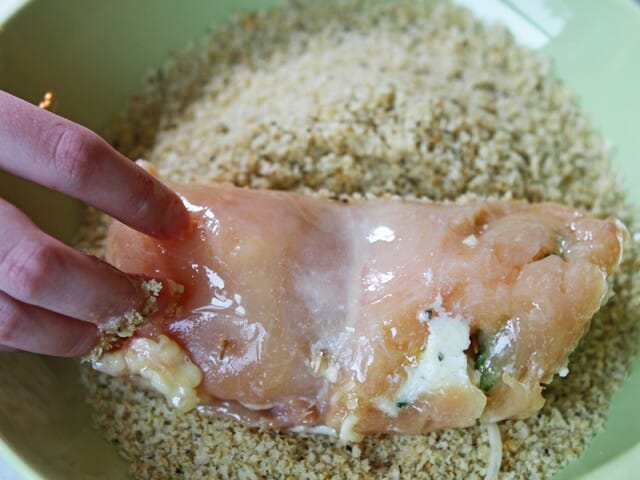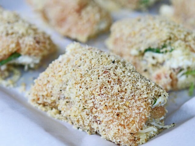 Roll each stuffed chicken breast in melted butter, then roll in the Italian seasoned bread crumbs and place on the prepared baking sheet. Bake for 35-40 minutes in the preheated oven or until the chicken is cooked through. If you want to brown the tops a little, turn on the low broiler for 1-2 minutes (be sure to  keep an eye on it–burning things at this point would be very sad). Makes 6 servings.