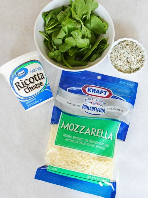 kosher salt and freshly ground black pepper, spinach leaves, ricotta cheese, garlic bread seasoning, and mozzarella cheese.