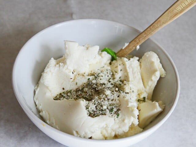 Preheat oven to 350. Mix together the ricotta cheese and garlic bread seasoning and set aside. Line a baking sheet with parchment paper and set aside.