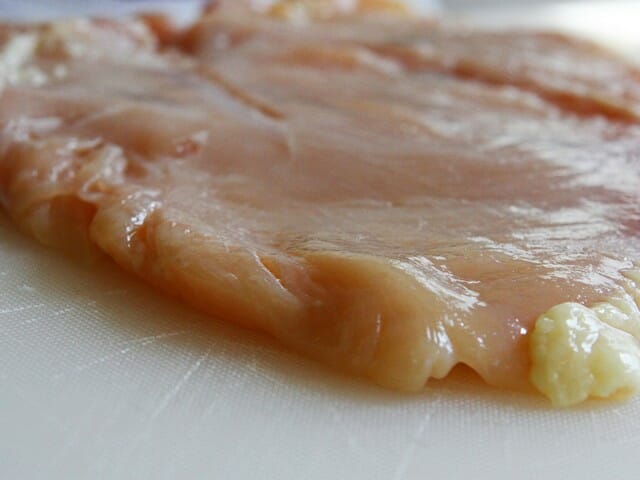 Pound the chicken breast with a meat mallet until it’s about 1/4″ thick (it will have spread considerably).