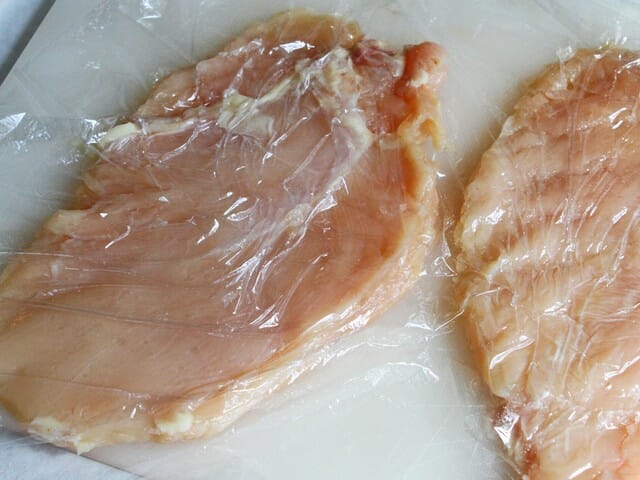 Place a chicken breast flat on a plastic cutting board and cover the entire board with a piece of plastic wrap. Pound the chicken breast with a meat mallet until it’s about 1/4″ thick (it will have spread considerably). Cut the pounded chicken breast in half. Repeat with remaining chicken breasts.