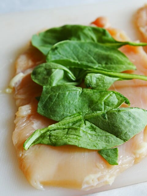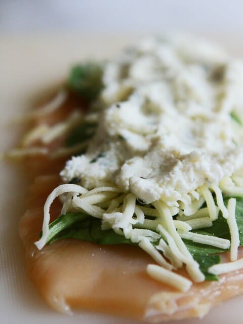 Line a chicken breast with spinach leaves. Spread about 2 tablespoons of the ricotta mixture over the spinach leaves, leaving about a 1/2″ margin from each edge, then sprinkle with mozarella. Starting at on one end, carefully roll up each chicken breast and secure with 2 toothpicks. Repeat with the remaining chicken breasts.