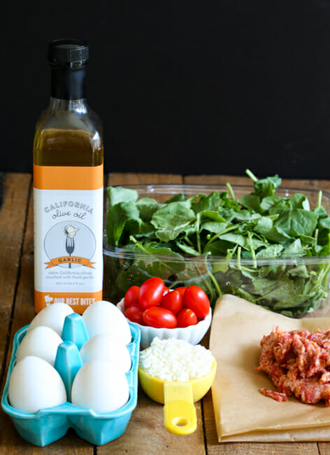 - Eggs and egg whites – The combination of whole eggs and egg whites results in a rich, flavorful frittata with a nice fluffy texture and also slightly reduced fat and calories. While fat content will affect the finished product and texture slightly, there is wiggle room here and you can absolutely sub in another whole egg for the two egg whites if desired.
