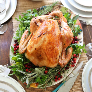 - Thermometer– You’ll also need an accurate meat thermometer that can be inserted into the turkey and left there while it’s roasting in the oven. Our very favorite is this Chef Alarm from Thermoworks, but there are lots of affordable options on Amazon as well.