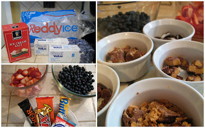 - Desired ice cream toppings and mix-ins we used sugared strawberries, blueberries, and crushed or chopped Butterfingers, Twix Bars, York Peppermint Patties, Reese's PB Cups, and Skor Bars