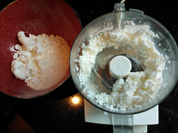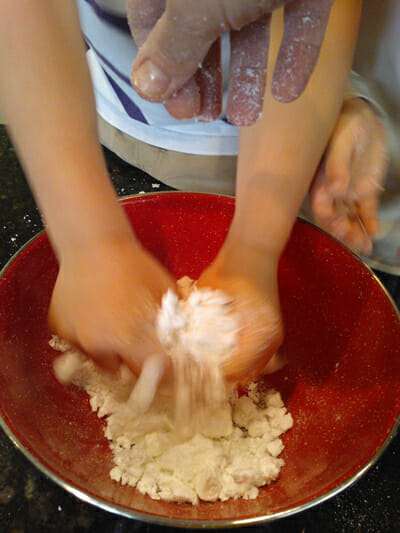 Then, either in a bowl with a spoon, or with an electric beater, or in a food processor, like I’m using, add warm water, just until it comes together. Just like pie crust, folks! This is why I love kitchen crafts. To test it, grab some with your hands and hold it in your fist. If it holds together in a ball, it’s ready.